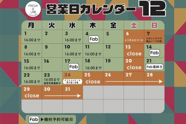 こんにちは!フレッシュラボ高山です☘今日は12月と年末年始の営業日のお知らせです!12月6日(土) レンタ…
