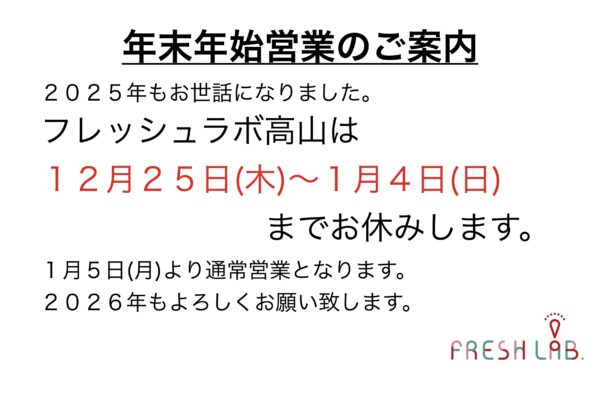 こんにちは。フレッシュラボ高山です☘本日が年内最終営業日でした😄今年も1年お世話になりまし…