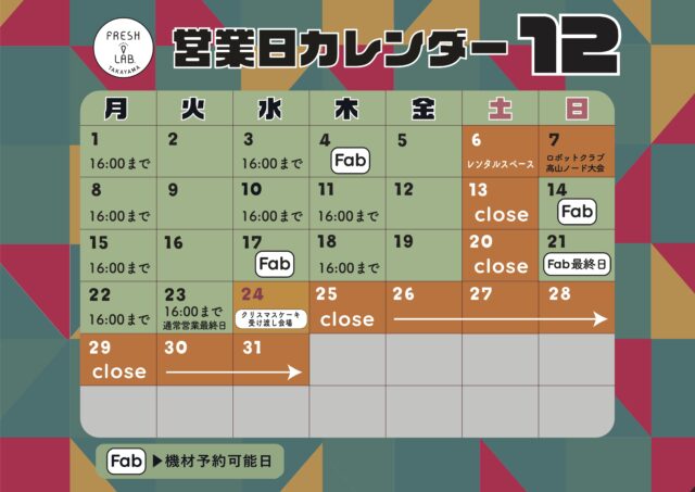 機材利用についてはご予約いただいた順に加工を進めさせていただきますので、お早めのご予約をお願い致します。